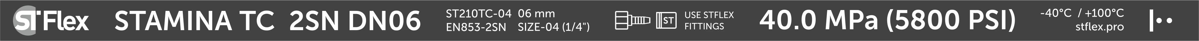 | ST210TC-04 Код заказа | 06 Внутренний диаметр: DN | 1/4 Внутренний диаметр: дюйм | -4 Внутренний диаметр: размер | 15,7 Наружный диаметр: мм | 400 Рабочее давление: бар | 5800 Рабочее давление: psi | 1600 Разрывное давление: бар | 23200 Разрывное давление: psi | 100 Радиус изгиба: min, мм | 0,36 Вес: кг/м | ST03310-04 Муфта | – Складская позиция | |