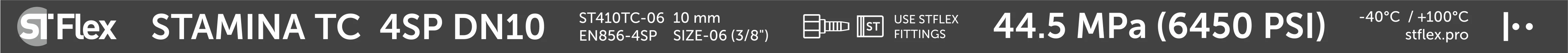 Рукав высокого давления 4SP EN 856 Stflex Stamina TC обозначен желтой маркировкой, указывающей на повышенную стойкость к абразивным, механическим и вибрационным воздействиям. Шланг из синтетического каучука имеет специальное износостойкое наружное покрытие и четыре проволочных оплетки для работы при высоком и повышенным давлением. Конструкция рукава обеспечивает безопасный зазор между взрывным и рабочим давлением, возможность прокачки воды, воздуха и жидкостей с содержанием нефтепродуктов. Повышенная механическая износостойкость позволяет располагать рукав рядом с подвижными частями агрегатов. Производится в соответствии со следующими стандартами: EN 856, ISO 3862.